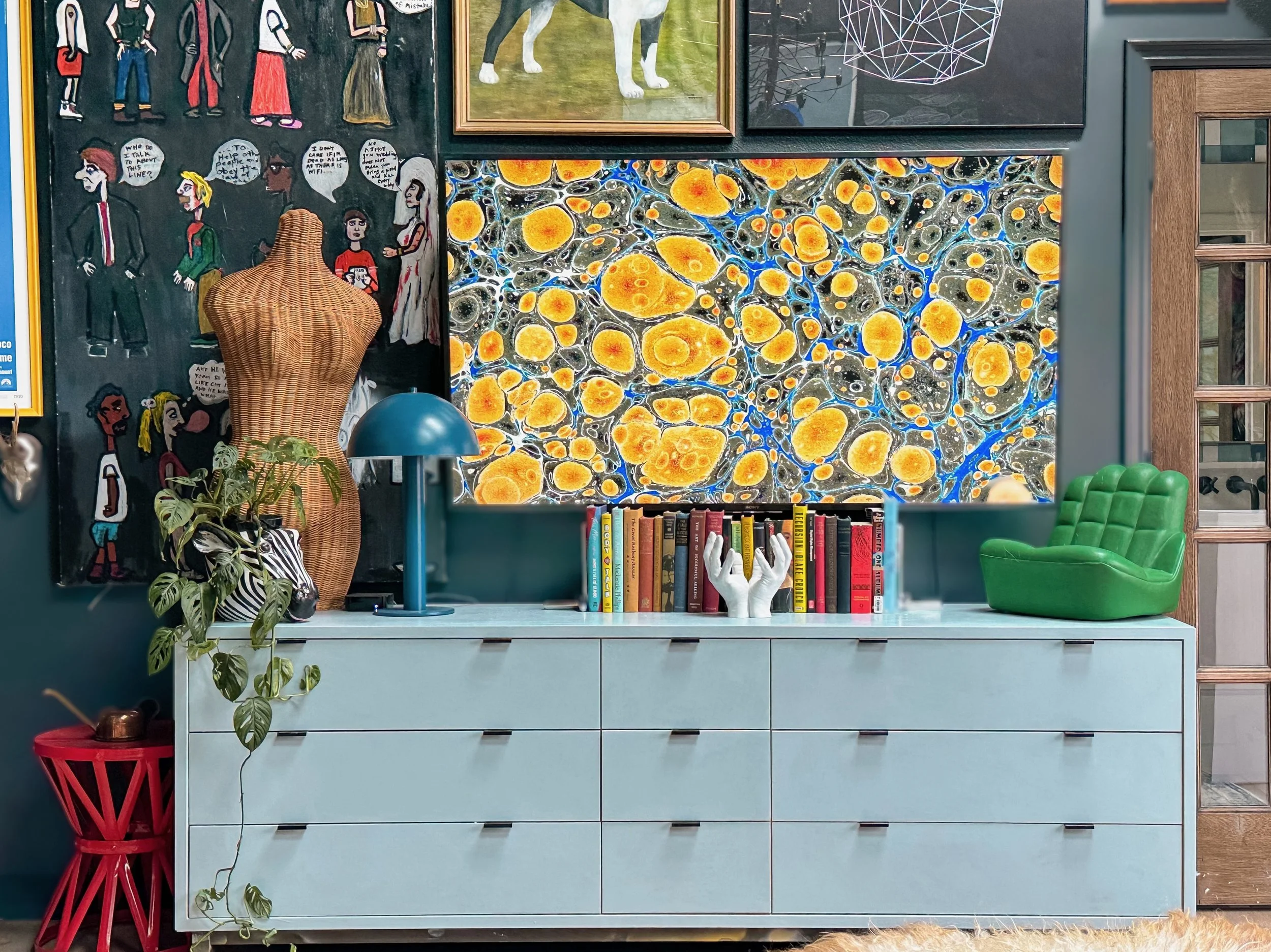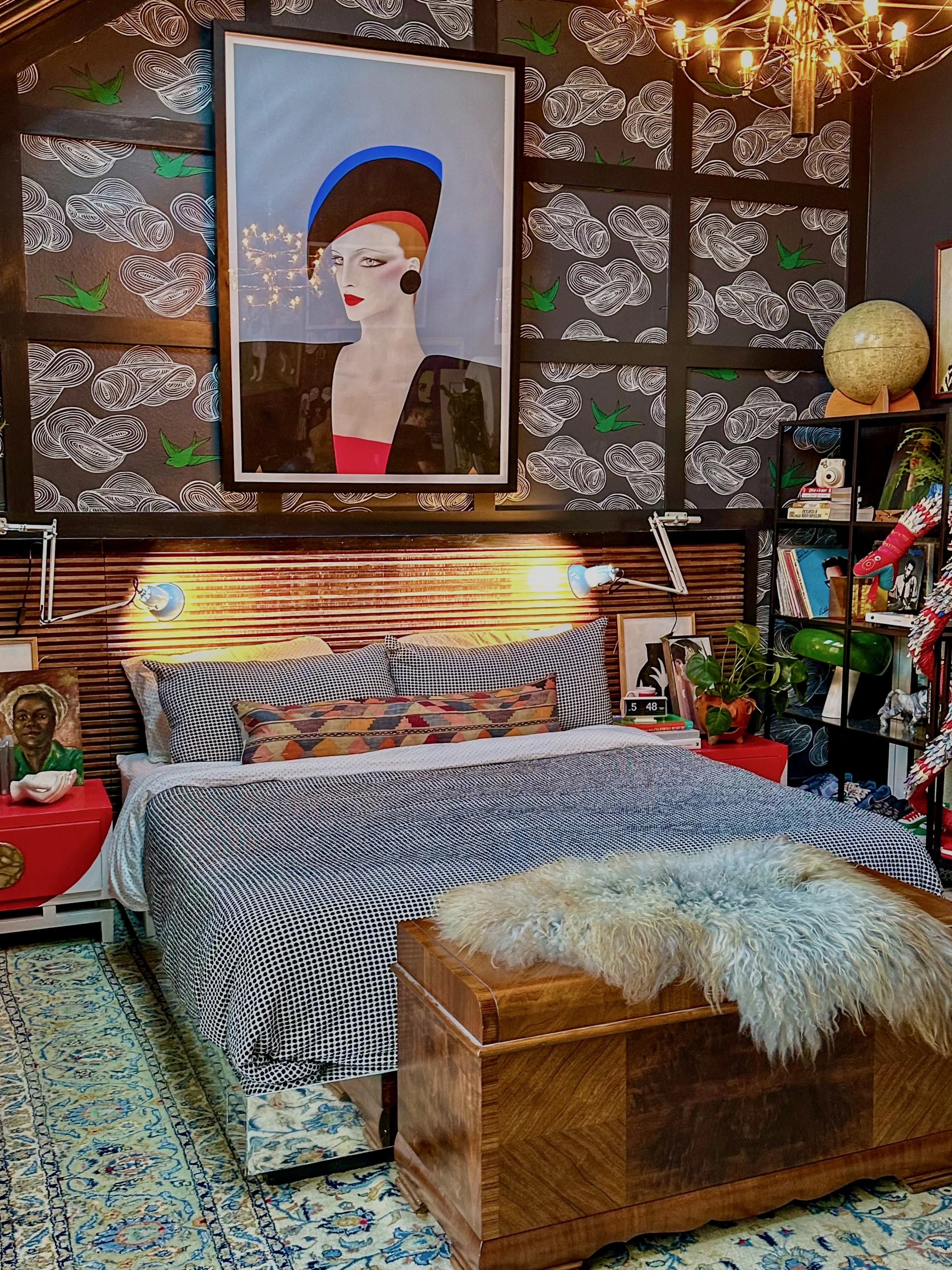 I set out to design a room that defied expectations, didn’t conform to any typical interior design aesthetic standards, was curated and maximalist, colorful but warm, edgy AND elegant.