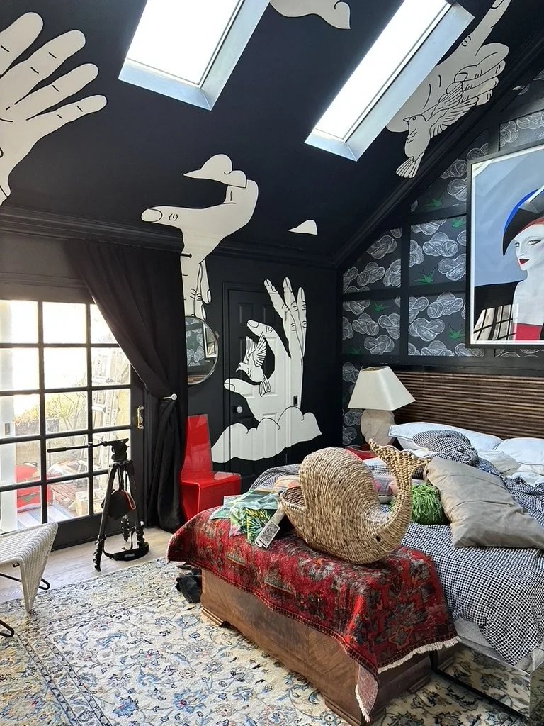 Work is fine. Clients are fine. I even feel like an adult sometimes. But the second I step into my bedroom, it’s like I’ve wandered into a rehearsal space for a band that doesn’t know its sound yet—loud, messy, full of questionable choices, and every so often brilliant by accident. One minute I’m shouting “I’m a genius!” the next I’m muttering “I suck” into a paint tray. That’s the process soundtrack. And the only thing more ridiculous than the room itself? My endgame: the Domino Dream. Yes, I want my bedroom—of all rooms, the bedroom—to end up in Domino. People usually hide their bedrooms under laundry piles and regret. I’m trying to get mine photographed. Punk move, right? (Also: why does every laundry basket look like a modern sculpture when you’re procrastinating folding it?)