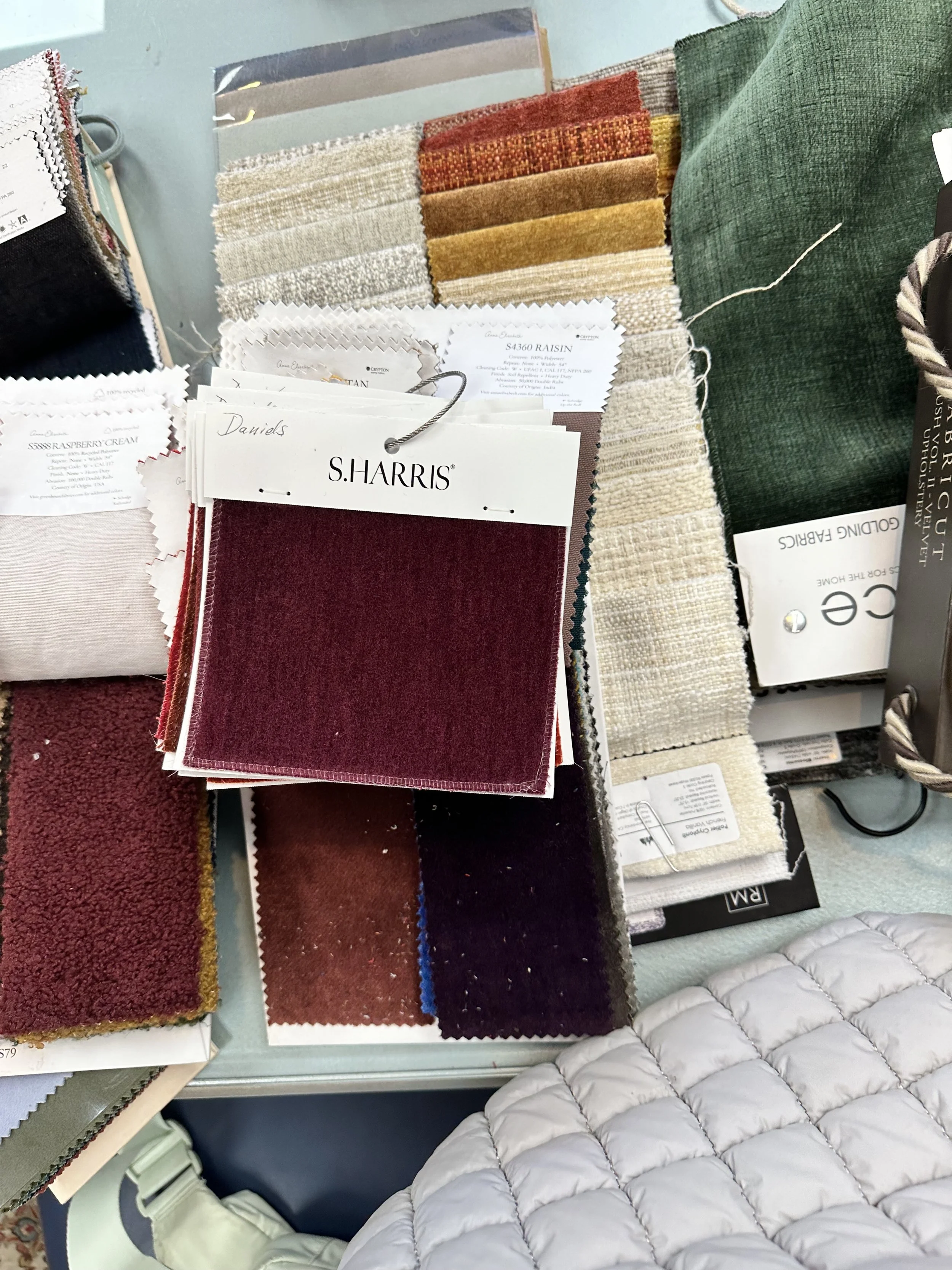 Now the vision is clearer. The blue sofa is still waiting, but the plum is in my head like a melody that won’t leave. The rug will ground it all, warm it up, give the room a reason to exhale. I’ve started editing like a cinematographer—fewer tall pieces along the sofa wall so the mural can breathe, a single metallic accent to catch light, no chrome, no clutter. Art raised just enough to breathe. Space between objects feels more important than the objects themselves.