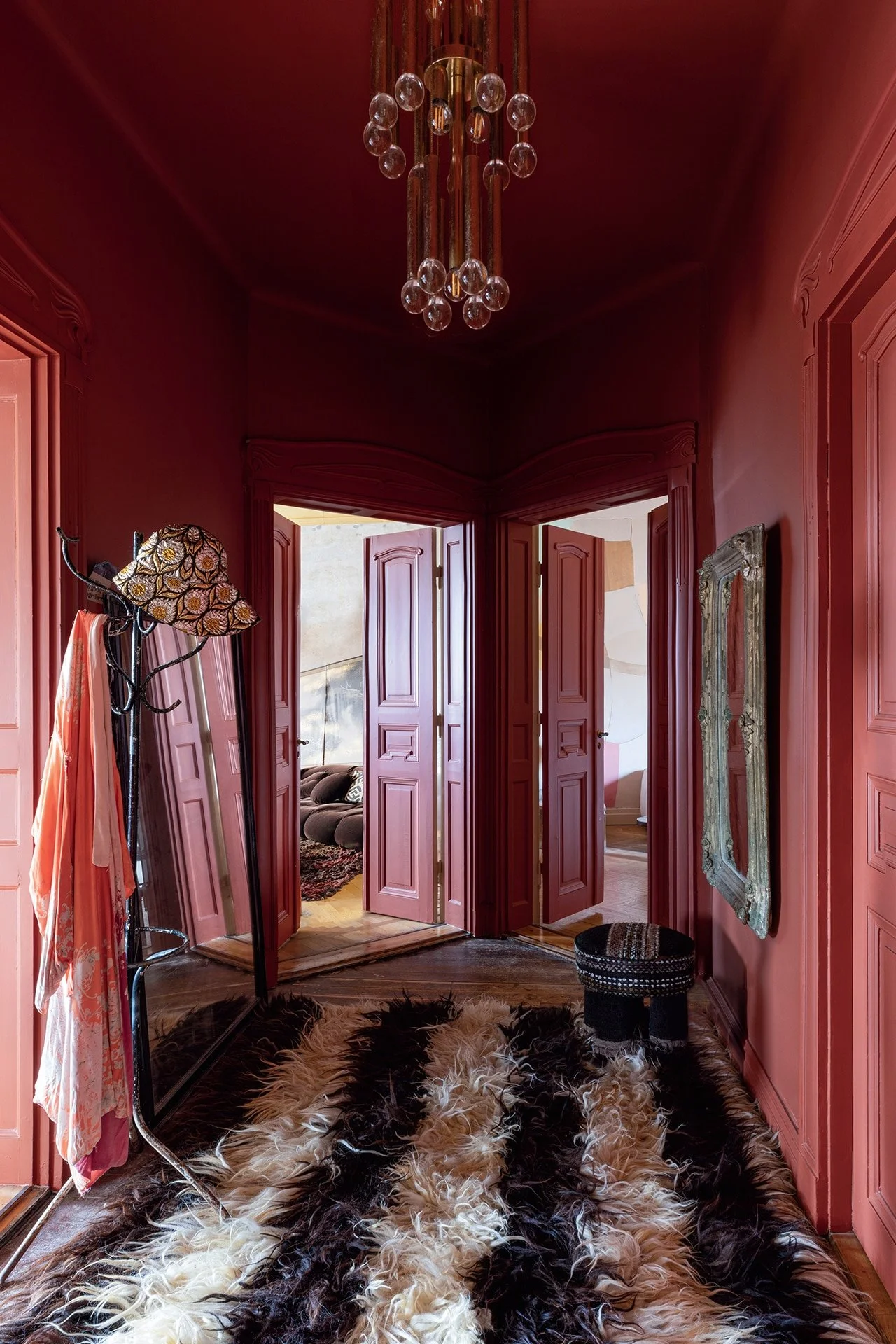Plum works because it deepens the shadows and lets the rest of the room hum quietly instead of shout. It bridges everything—the mural, the ochre, the gold accents—without defaulting to beige. It’s mature but strange, deliberate but still a little wild. Domino isn’t about perfection; it’s about pulse. And this, finally, feels like pulse.